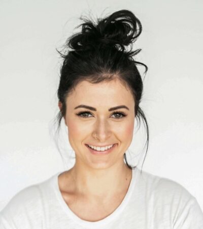 A beautifully arranged gourmet dish sits on a textured ceramic plate. The dish features a colorful assortment of vegetables, vibrant greens, and delicate edible flowers. A polished knife with a decorative handle is placed next to the plate, suggesting an emphasis on presentation and fine dining.